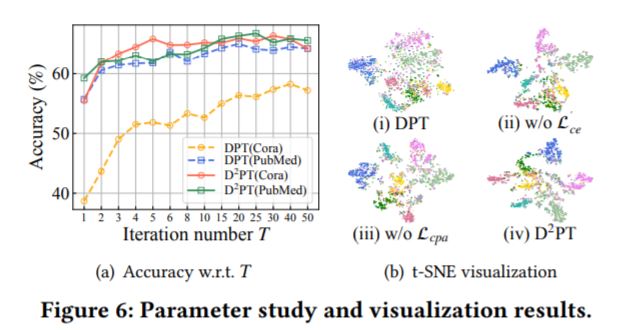 ·仅带有图扩散机制,没有全局图、原型对比学习的\(DPT\)模型需要训练更多的epoch,准确率才会达到较好水准;且\(DPT\)准确率不及\(D^2PT\)。