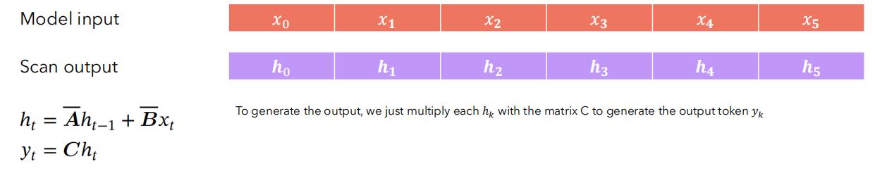 - 迭代计算\(h(t + \Delta)\):\(h(t + \Delta) \simeq \Delta(Ah(t) + Bx(t)) + h(t)\newline = (I + \Delta A)h(t) + \Delta Bx(t) \newline = \bar{A}h(t) + \bar{B}x(t)\)