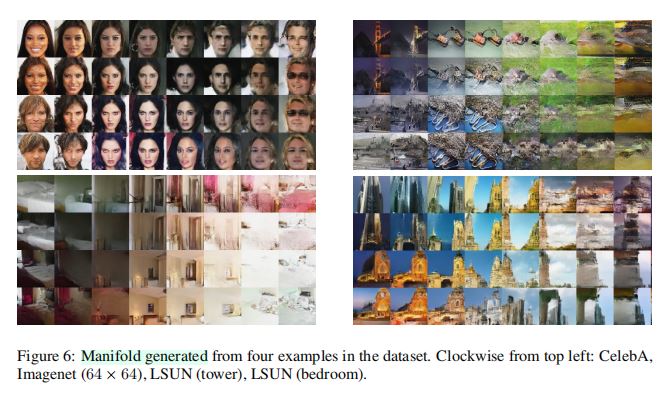GAN均不同,作者提出的技术能够学习一个具有丰富语义信息,并且维度和输入空间一样高的隐空间。这可能使该算法尤其适合半监督学习任务,作者也希望在未来工作中进行相关的研究。