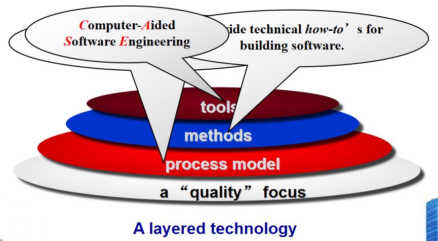 (3)方法:包括需求分析、设计、测试、构造等,即如何构造软件。